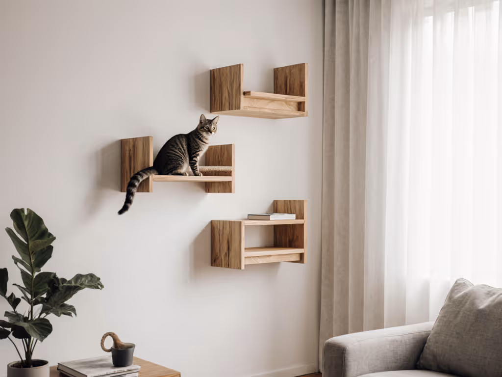 - Install wall-mounted shelves instead of floor-hogging cat trees