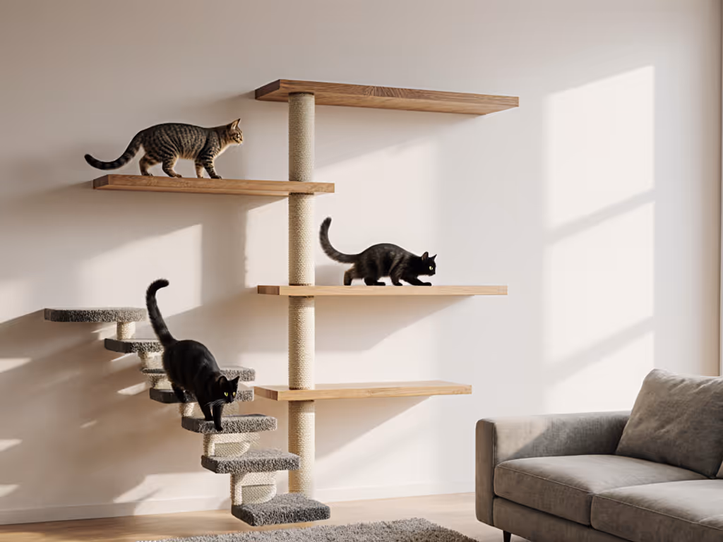 Cats need to move through space, not just in space. Vertical routes with staggered shelves and secure ledges create natural movement patterns that satisfy hunting instincts. Not sure which structures fit your home? See our wall shelves vs cat trees guide.