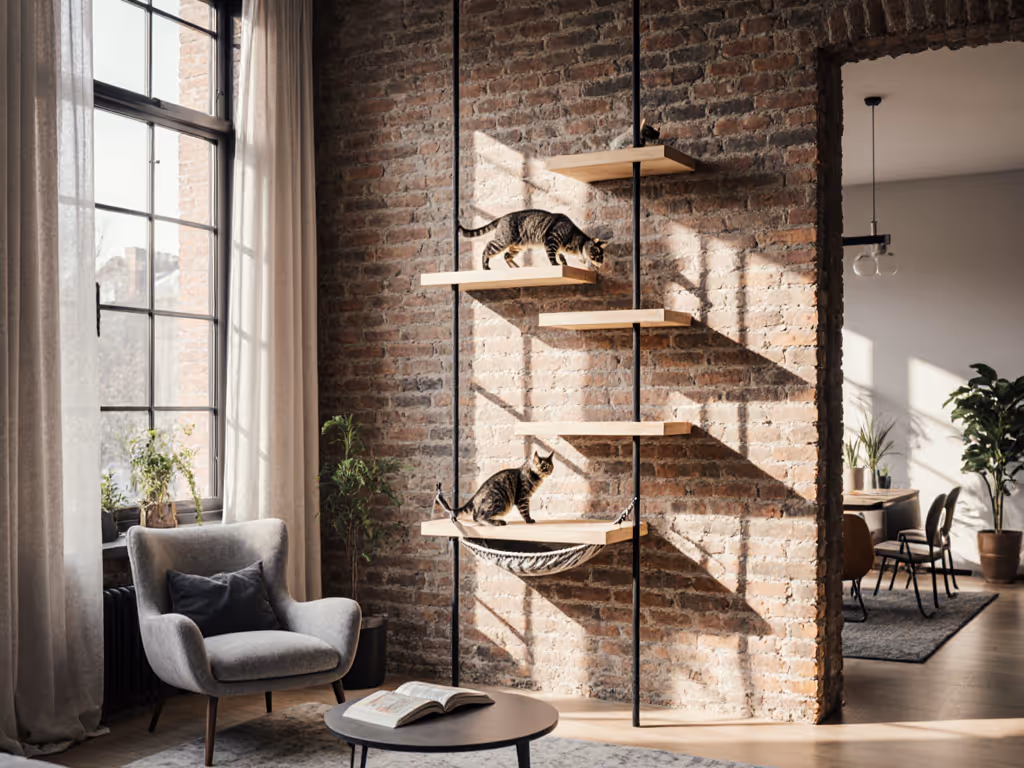 - Start low: Install your first shelf or platform at paw-reach height (typically 12-18" off floor)